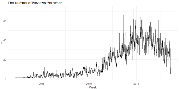 在2014年末,周评论数量达到最高峰。那一个星期里酒店被评论了70次。
