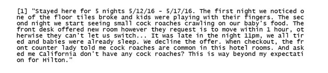 最消极的评论来自于ID为3748的记录:“(我)住了5晚(16年5月12日-5月17日)。第一晚,我们发现地砖坏了,小孩子在玩手指。第二晚,我们看到小蟑螂在儿童食物上爬。前台给我们换了房间,但他们让我们一小时之内搬好房间,否则就不能换房。。。已经晚上11点,我们都很累了,孩子们也睡了。我们拒绝了这个建议。退房的时候,前台小姐跟我讲,蟑螂在他们的旅馆里很常见。她还反问我在加州见不到蟑螂吗?我没想到能在Hilton遇到这样的事情。”