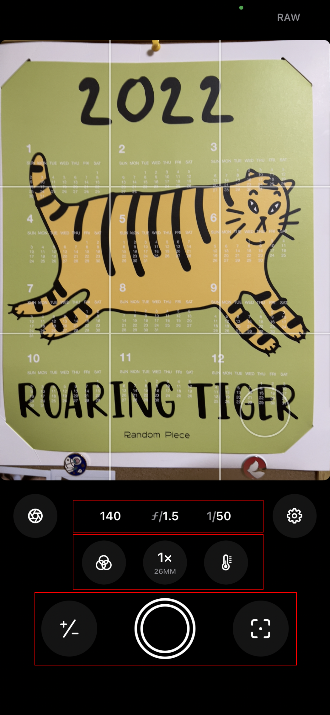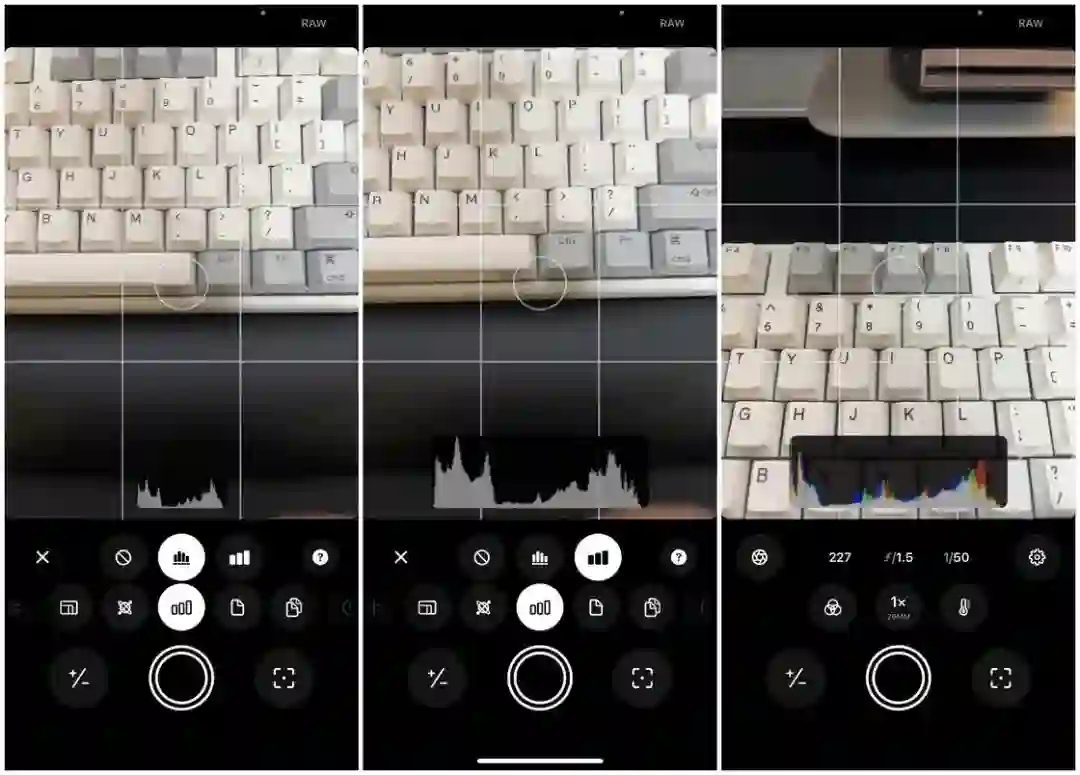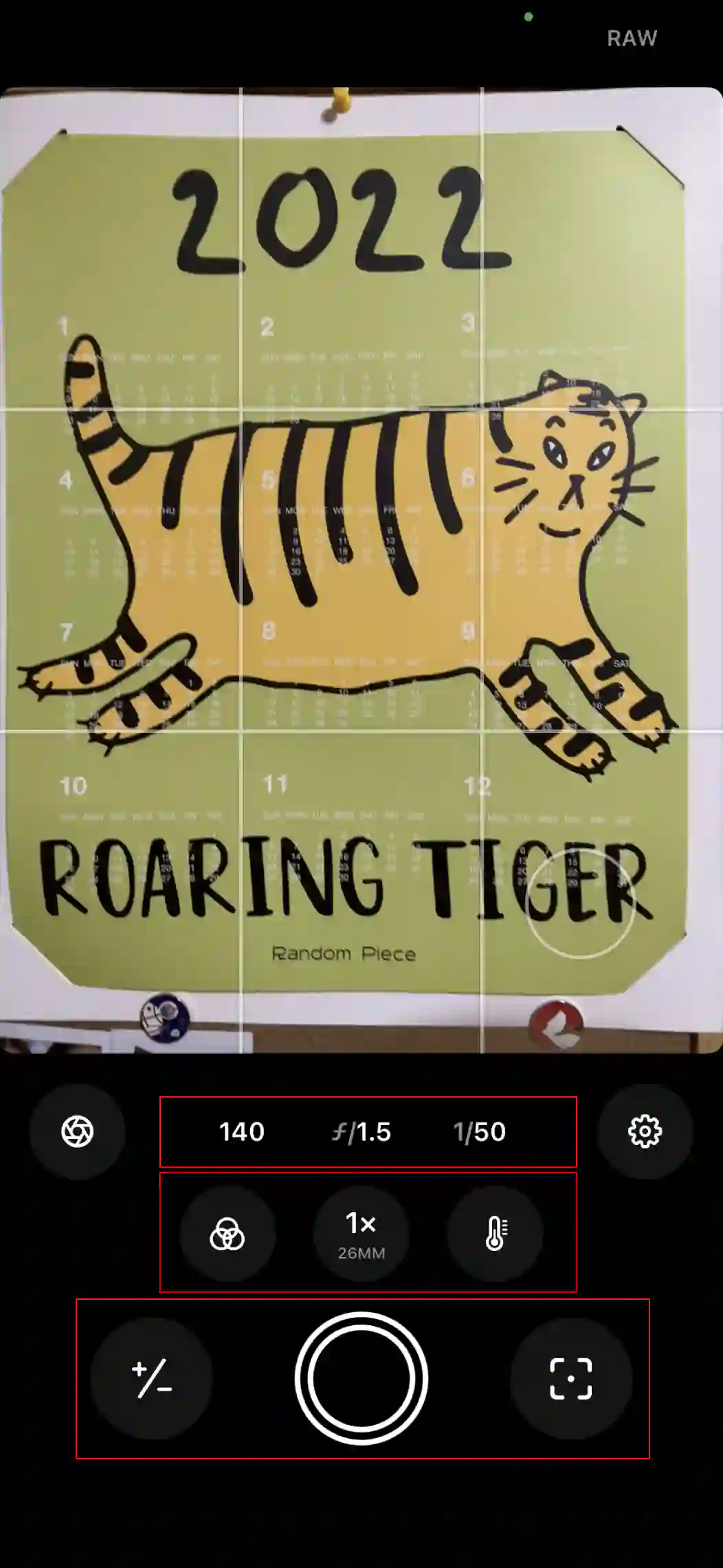 专业拍照模式的控制功能可以根据按钮的排列分为 3 个部分:第一行展示的三个参数分别代表了 ISO、镜头焦段和快门速度,第二行的两个按钮控制的是白平衡,第三行的两个按钮控制的是前面提到过的对焦和曝光。