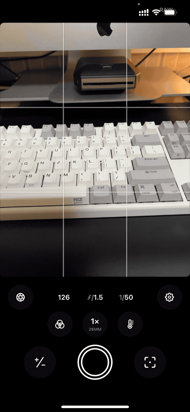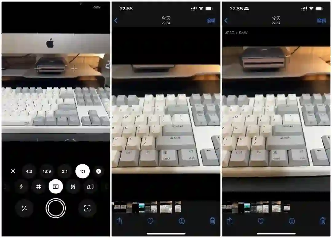 除了相机本身,Obscura 还提供了非常多的拍摄辅助功能。比如说画面比例功能,可以更改取景画面的大小,一共有 4:3、16:9、2:1、1:1 四种选项,为创意拍摄提供了更多的帮助。值得一说的是,如果我选择了 RAW 格式拍摄照片,那么在相册中会同时保留原尺寸的照片和裁切过的照片。