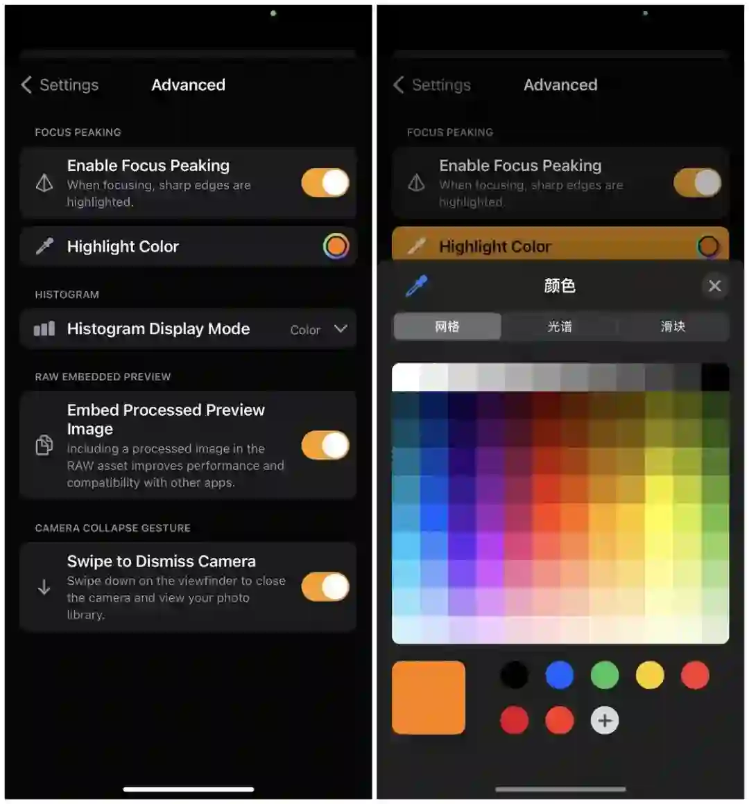 值得一提的是,在设置中我可以为对焦功能启用或者关闭峰值对焦功能,还可以任意设置高亮的颜色。