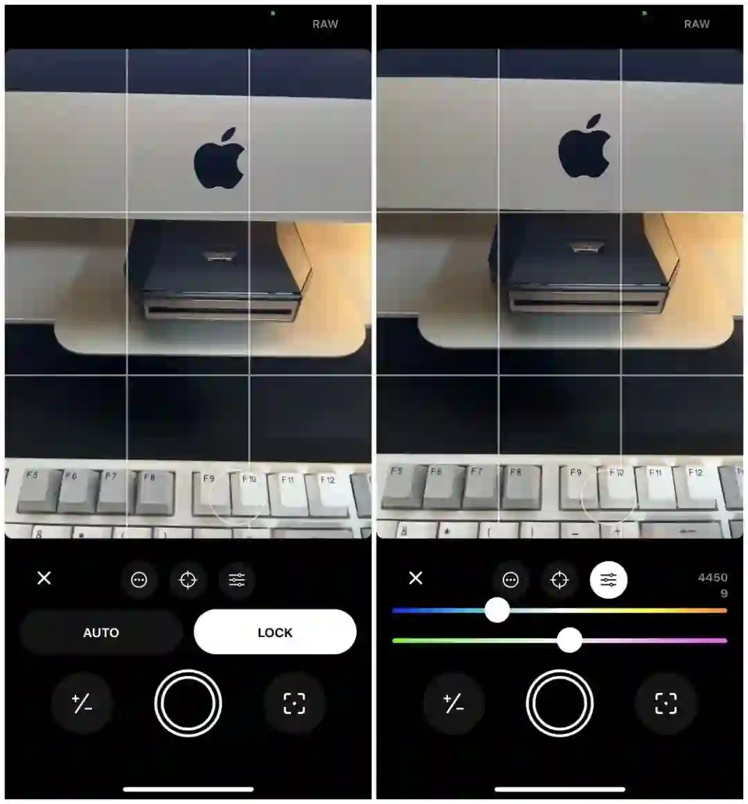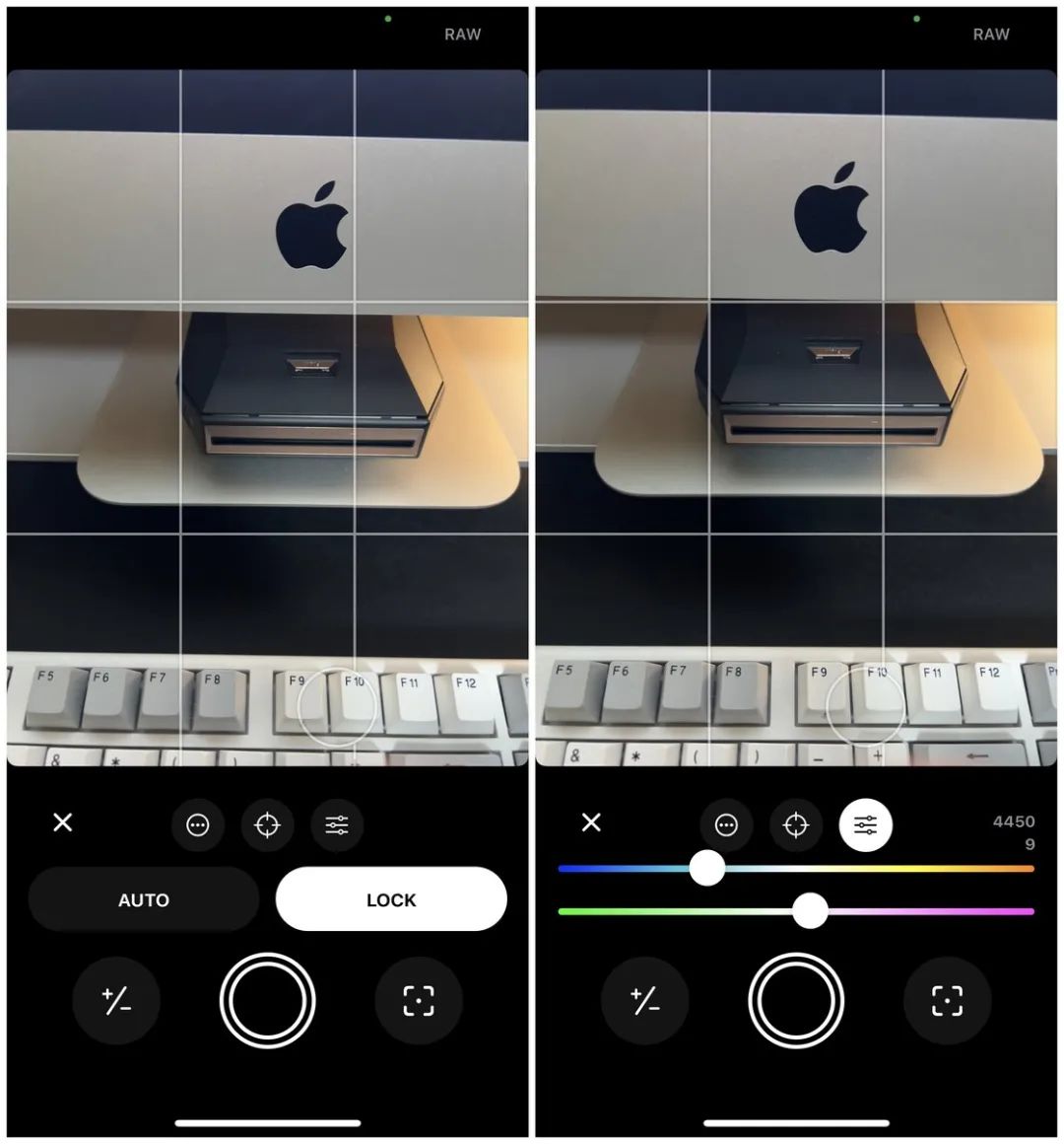 点击右边的按钮还可以进入更多的白平衡选项,其中我最喜欢的是自动和锁定白平衡的功能,特别是在室内光线不足的情况下很容易导致白平衡跑偏,而锁定功能可以帮助我找到一个合适的白平衡。另外,我也可以通过两个色阶的滑块来调整白平衡,算是对环形选择器的一个补充。