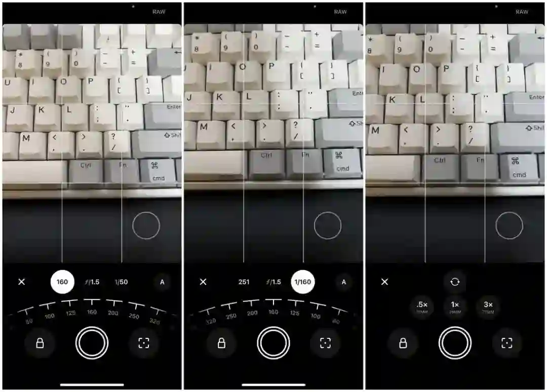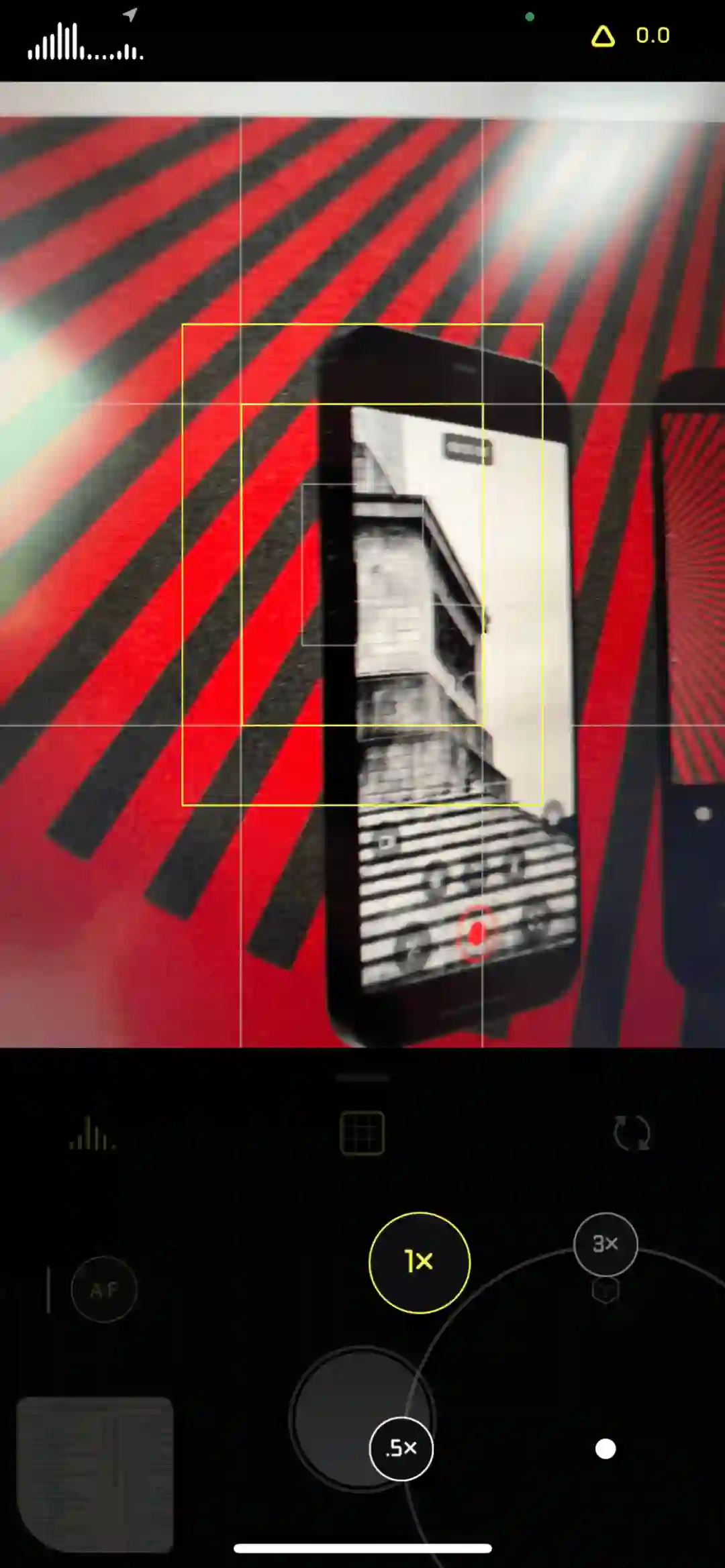 有意思的是,点击镜头焦段的数字却不能切换镜头,而是要通过点击第二行中间的按钮,这个设计感觉有点冗余了。另外,在选择放大倍率时 Obscura 只能在 0.5 倍、1 倍、3 倍之间选择其一,而不像 iPhone 原生相机一样可以实现 0.5 倍与 15 倍之间的无级调节。