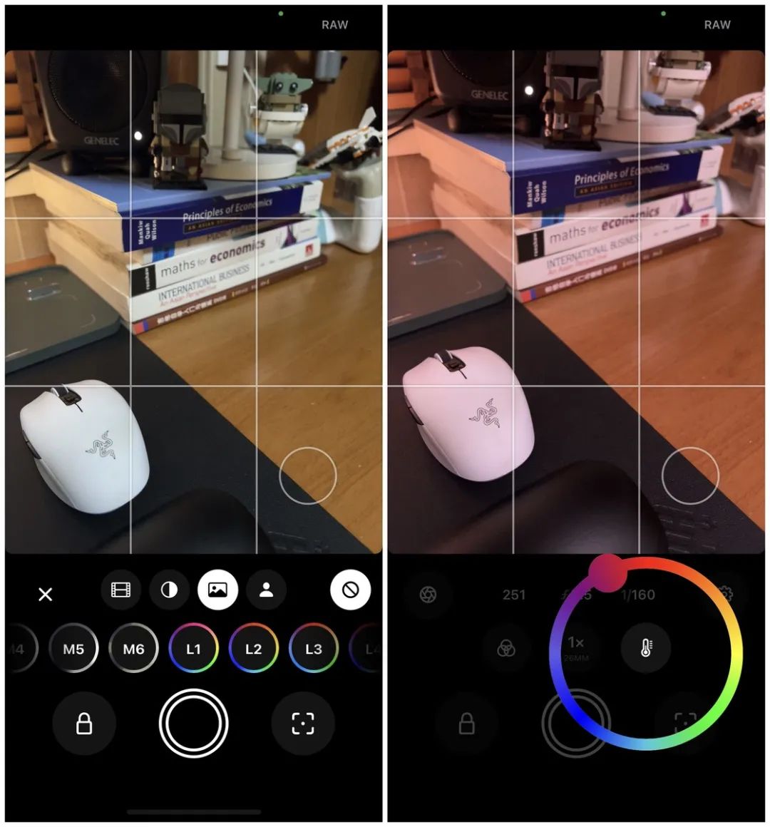 我认为 Obscura 的白平衡功能是摄影 App 中做得比较出色的,因为它把功能划分得很清晰。在镜头焦段切换按钮的左边是白平衡场景,对于摄影小白或者追求快速切换白平衡的情况,使用预设场景可以达到便捷实用的效果。如果我对白平衡有更高的要求,那么长按右边的按钮向外滑动就可以弹出环形选择器,通过滑动就可以选择任意颜色的白平衡。