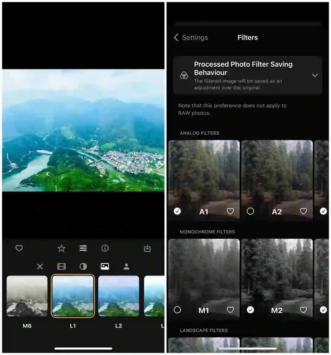 除了照片管理,Obscura 的照片库还提供了滤镜的功能,将一定数量的滤镜按照使用场景进行分组,就可以快速套用。在设置中,我还可以自定义每个场景的滤镜,自由地进行添加或者移除。