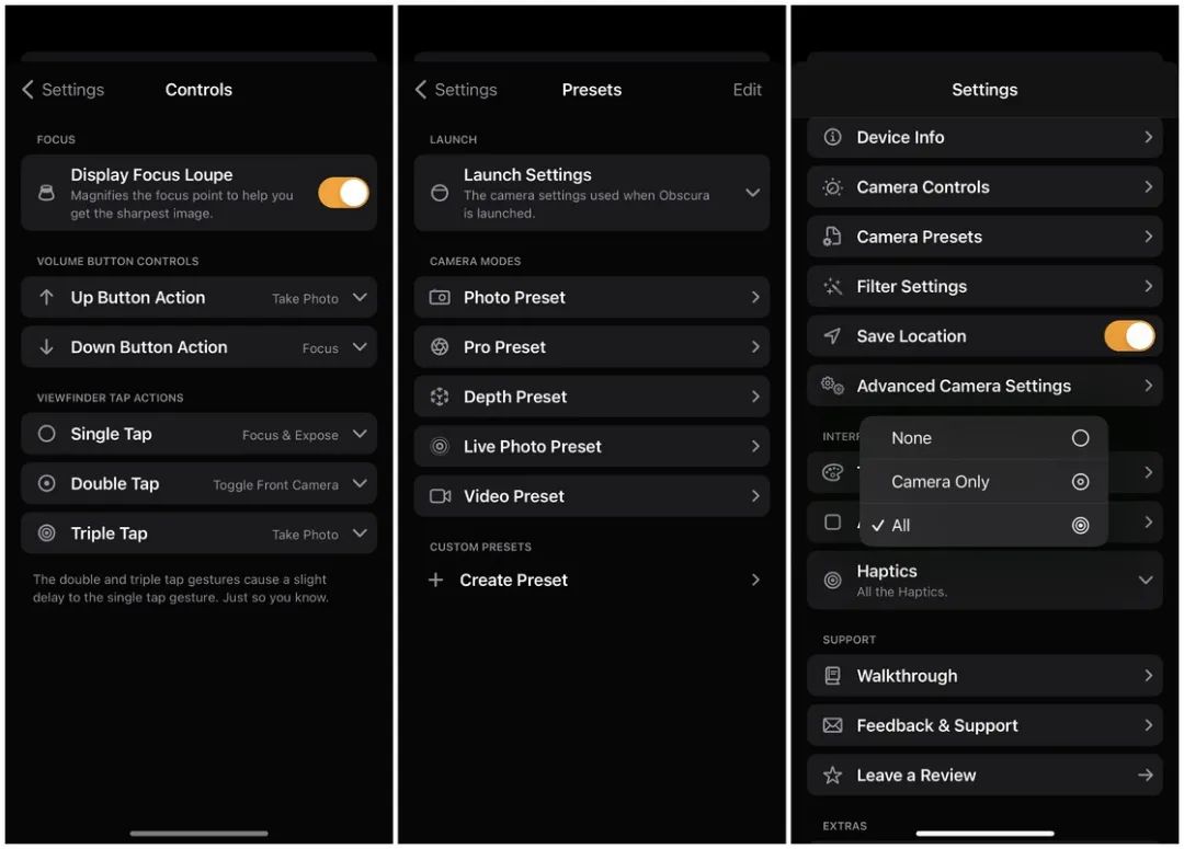 Obscura 在设置中也提供了很多个性化的自定义选项,比如说音量上下键、取景器都可以设置为不同的动作效果,每一个拍摄模式都可以提前做好各个参数的预设,连 Haptic Engine 的震动效果都可以指定生效的对象。