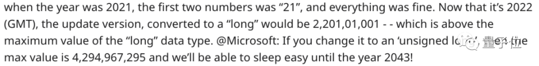 对此有网友调侃,如果微软在修复中把有符号变量改成无符号变量,那么数据的表示范围就会变成0~4294967295,Exchange邮箱又可以用到2043年了。
