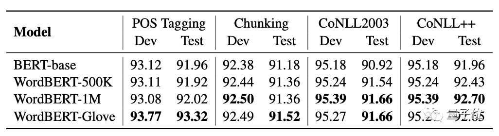 在词性标注、组块分析和命名实体识别(NER)等分类任务中,WordBERT的成绩如下: