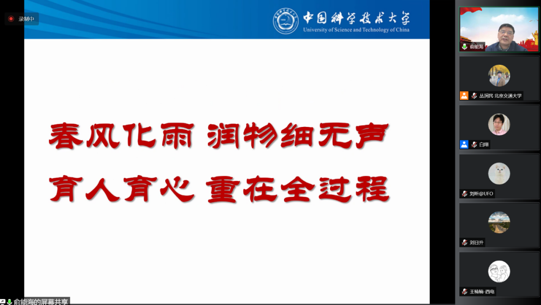 随后,俞能海教授结合自身从教30年的经历,做了“立德树人、为国育才”的主题分享。俞老师从自己在中科大发展信息安全专业、创建网络空间安全学院讲起,强调年轻人应该将自身的发展与国家的重大战略需求联系起来,秉承科学家精神,时刻准备着,紧抓机遇,踏实肯干,为实现科技强国贡献自己的力量。同时,俞老师强调,作为一名人民教师应该尊重育人规律,紧密把握育人全过程,坚守立德树人使命,不忘初心,发扬“延安精神”,不断学习党的历史、党的精神、党的政策,以更好地指导我们的日常科研与教学过程,为国培养创新型科技尖兵。最后,俞老师将自身30年的从教经验汇聚为“春风化雨 润物细无声,育人育心 重在全过程”的感悟,与大家共勉。