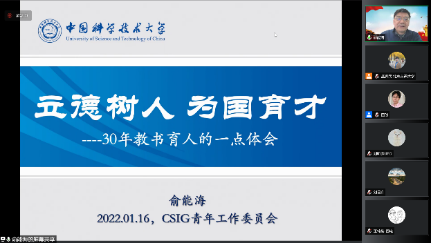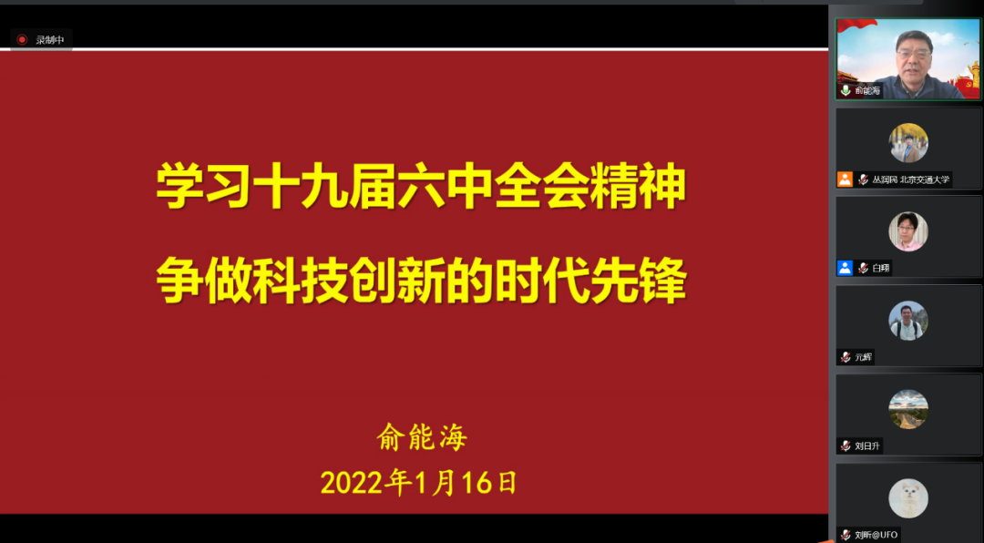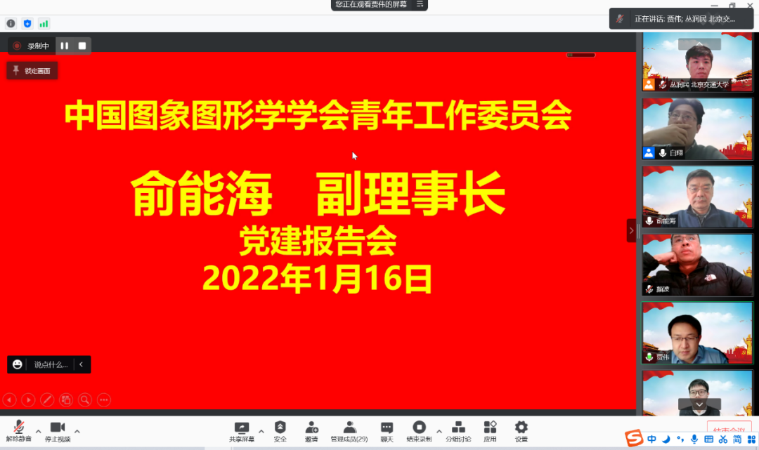 2021年1月16日,中国图象图形学学会青年工作委员会(青工委)开展了学习贯彻党的十九届六中全会精神宣讲活动。此次活动邀请了学会党委副书记、副理事长俞能海教授作党建主题报告,青工委执行委员、秘书处成员近30人参加了此次学习活动。俞能海副理事长作了“学习十九届六中全会精神,争做科技创新的时代先锋”的报告。由于新冠肺炎疫情影响,会议采取线上方式举行,由青工委贾伟秘书长主持。青工委白翔主任在致词中表示,党建活动是青工委的重要工作之一,要持续性和高质量的开展下去,努力打造一支思想政治过硬、业务技能过硬、工作作风过硬的学会青年党员队伍。