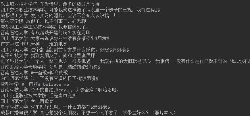 #!/usr/local/bin/python2.7   # -*- coding: utf8 -*-   """     超级课程表话题抓取   """   import urllib2   from cookielib import CookieJar   import json   ''' 读Json数据 '''   def fetch_data(json_data):       data = json_data['data']       timestampLong = data['timestampLong']       messageBO = data['messageBOs']       topicList = []       for each in messageBO:           topicDict = {}           if each.get('content', False):               topicDict['content'] = each['content']               topicDict['schoolName'] = each['schoolName']               topicDict['messageId'] = each['messageId']               topicDict['gender'] = each['studentBO']['gender']               topicDict['time'] = each['issueTime']               print each['schoolName'],each['content']               topicList.append(topicDict)       return timestampLong, topicList   ''' 加载更多 '''   def load(timestamp, headers, url):       headers['Content-Length'] = '159'       loadData = 'timestamp=%s&phoneBrand=Meizu&platform=1&genderType=-1&topicId=19&phoneVersion=16&selectType=3&channel=MXMarket&phoneModel=M040&versionNumber=7.2.1&' % timestamp       req = urllib2.Request(url, loadData, headers)       loadResult = opener.open(req).read()       loginStatus = json.loads(loadResult).get('status', False)       if loginStatus == 1:           print 'load successful!'           timestamp, topicList = fetch_data(json.loads(loadResult))           load(timestamp, headers, url)       else:           print 'load fail'           print loadResult           return False   loginUrl = 'http://120.55.151.61/V2/StudentSkip/loginCheckV4.action'   topicUrl = 'http://120.55.151.61/V2/Treehole/Message/getMessageByTopicIdV3.action'   headers = {       'Content-Type': 'application/x-www-form-urlencoded; charset=UTF-8',       'User-Agent': 'Dalvik/1.6.0 (Linux; U; Android 4.1.1; M040 Build/JRO03H)',       'Host': '120.55.151.61',       'Connection': 'Keep-Alive',       'Accept-Encoding': 'gzip',       'Content-Length': '207',       }   ''' ---登录部分--- '''
