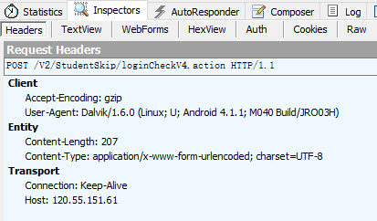 import urllib2   from cookielib import CookieJar   loginUrl = 'http://120.55.151.61/V2/StudentSkip/loginCheckV4.action'   headers = {       'Content-Type': 'application/x-www-form-urlencoded; charset=UTF-8',       'User-Agent': 'Dalvik/1.6.0 (Linux; U; Android 4.1.1; M040 Build/JRO03H)',       'Host': '120.55.151.61',       'Connection': 'Keep-Alive',       'Accept-Encoding': 'gzip',       'Content-Length': '207',       }   loginData = 'phoneBrand=Meizu&platform=1&deviceCode=868033014919494&account=FCF030E1F2F6341C1C93BE5BBC422A3D&phoneVersion=16&password=A55B48BB75C79200379D82A18C5F47D6&channel=MXMarket&phoneModel=M040&versionNumber=7.2.1&'
