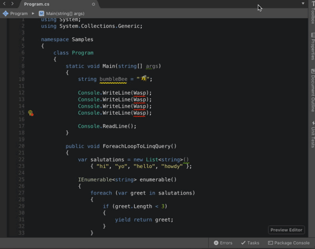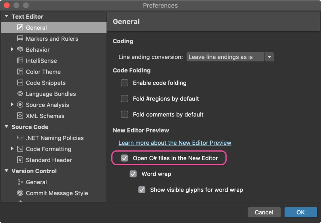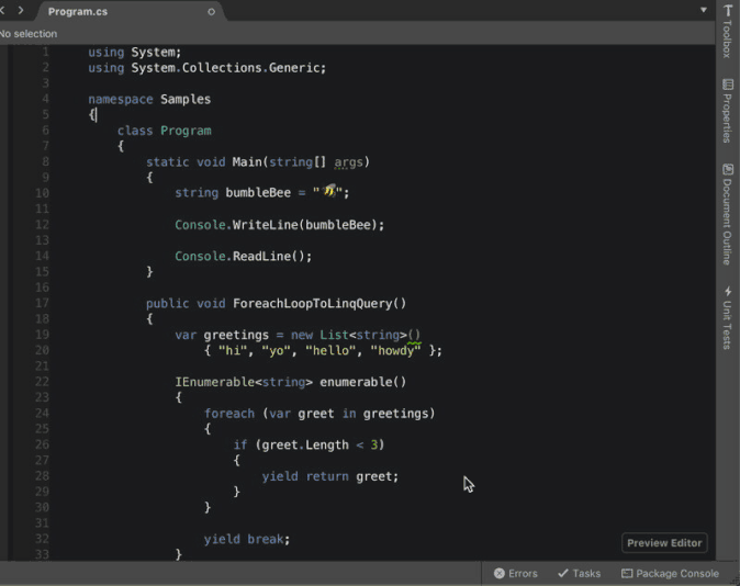 首次展示了新的、快速、流畅且高性能的 C# 编辑器,它基于与 Windows 上的 Visual Studio 相同的核心编辑器,添加了原生 macOS UI,以确保在 Mac 上没有违和感。除了提供平滑编辑和导航的增强体验,新编辑器还具有所有 Visual Studio 编辑器所有的强大的 IntelliSense/代码补全和快速修复建议等功能。