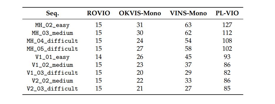 3. 在EuRoC数据集和PennCOSYVIOlet数据集上将本文提出的PL-VIO和ROVIO、OKVIS以及VINS-Mono进行了对比。