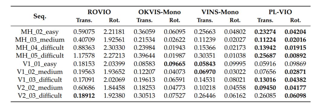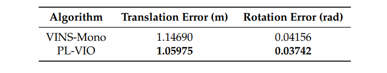 作者使用两个公开基准数据集来评测PL-VIO:EuRoc MAV数据集和PennCOSYVIO数据集。通过和目前最先进的三种单目VIO(ROVIO、OKVIS、VINS)进行比较,验证了PL-VIO的优点。ROVIO是基于扩展卡尔曼滤波器(EKF)的紧耦合的VIO系统,它直接利用图像的亮度误差来寻找更新过程中的最优状态。OKVIS是一种具有点特征的滑动窗口优化算法,适用于单目或双目模式。VINS-Mono是一个完整的VIO-SLAM系统,它利用点特征来优化IMU在滑动窗口中的状态,并可以进行回环检测。所有实验均在Intel Core i7-6700HQ CPU 2.60 GHz, 16gb RAM, ROS dynamics的计算机上进行。