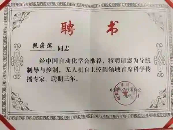 学科首席科学传播专家段海滨教授,北京航空航天大学国家重点实验室副主任,中国自动化学会无人飞行器自主控制专业委员会主任,中国航空学会制导导航与控制分会副主任,中国人工智能学会科普工作委员会副主任。