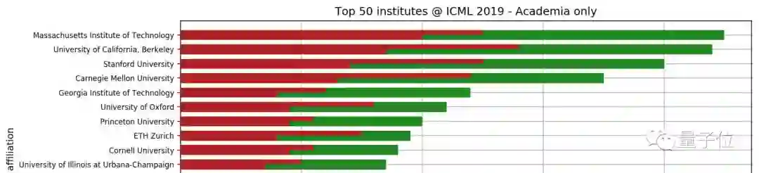 学校方面的排名前五的是:麻省理工学院47篇、加州大学伯克利分校45篇、斯坦福大学40篇、卡内基梅隆大学35篇、佐治亚理工学院24篇。