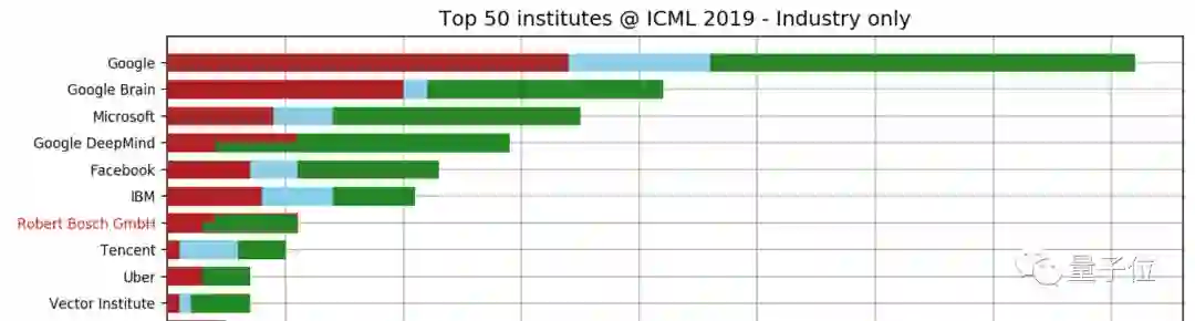 下图展示了各个公司被收录文章数量排名。条件是论文中至少有一位作者来自该机构,因此一篇论文可以出现在多个机构中。图片: