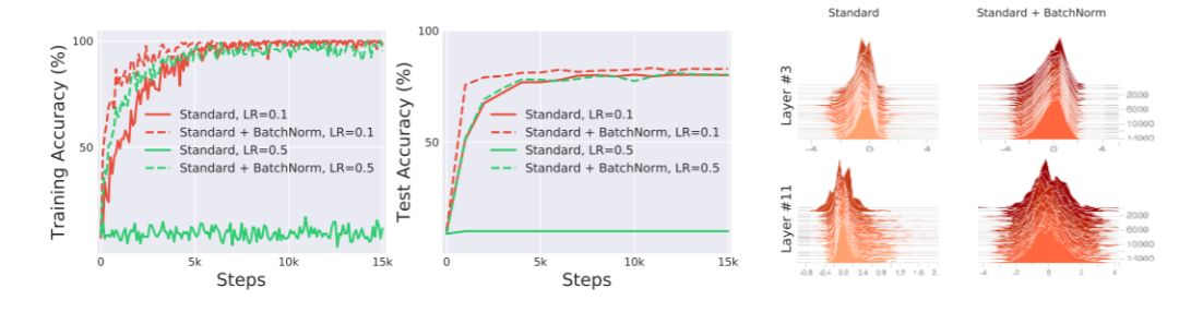 图 2:分布稳定性和 BatchNorm 性能之间的联系:我们比较了没有 BatchNorm 的 VGG 网络(Standard)、有 BatchNorm 的 VGG 网络(Standard+BatchNorm)和在 BatchNorm 层添加了显式「协方差偏移」的 VGG 网络(Standard+「Noisy」BatchNorm)。在最后一种情况中,我们通过添加独立于每个批归一化激活值的时变、非零均值和非单位方差噪声引入分布的不稳定性。尽管完全分布不稳定,但「Noisy」BatchNorm 模型的性能几乎与标准 BatchNorm 模型相当。我们采样了给定层的激活值并可视化了其分布(参见图 8)。