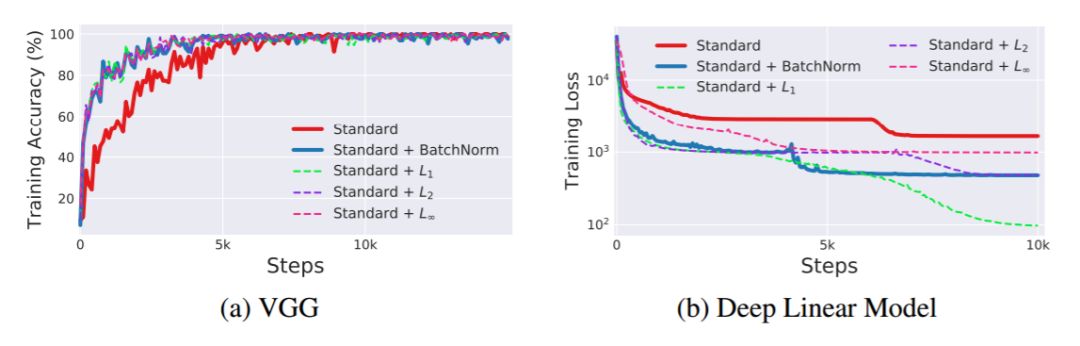 最后我们发现,这种平滑效果并不与 BatchNorm 唯一相关。其他一些自然归一化技术都有相似的效果(有时甚至更强)。即这些方法都提供了类似的训练性能提升。