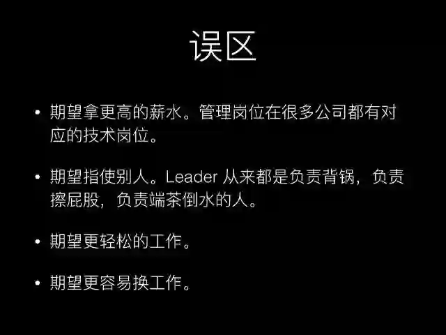 讲完成为管理者的原因,我觉得还有一些误区大家需要特别关注。我见到一些技术人他们想做管理者,但是当问这些技术人他们为什么要成为管理者时,我觉得他们的理由是不对的,这里我列给大家。