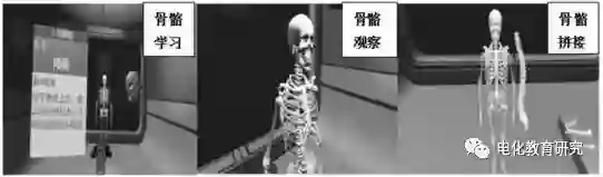 人体骨骼虚拟现实系统是本研究团队采用虚拟现实技术与azure平台构造的自适应学习系统。该系统主要分为三个部分:骨骼学习、骨骼观察与骨骼拼接,如图2所示。骨骼学习阶段,学生可以对各部位骨骼进行放大旋转,学习相关知识。在骨骼观察阶段,学生可以通过位置的移动,实现对人体骨骼组成结构的全方位观察,获得更直观的视觉体验,实现对人体骨骼细节处的深度学习。在骨骼拼接过程中,学生可以使用手柄拾取骨骼,将骨骼移动到对应的虚拟影像位置。在这个过程中,会直接调用相关数据库知识,为学生提供相应的知识与反馈信息。另外,在拼骨完成后,可以进入到知识问答环节,对学生的知识积累进行评价。整个过程中,学生在虚拟现实系统中的学习行为会被实时记录,结合大数据分析,提供实时的信息反馈与总结性评价。