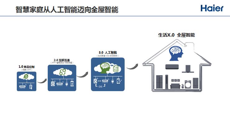 工业的发展经历了机械化、电气化、自动化、信息化、人工智能的过程,家电行业也经历了类似的阶段。5-6年前,大家比较热衷单品智能,把空调、洗衣机等联网,通过手机控制,这是第一阶段,第二阶段是互联互通,第三阶段是用人工智能解决交互的体验,后面是无处不在的全屋智能,生活X.0我们解读为老百姓对生活不断需求的提升。