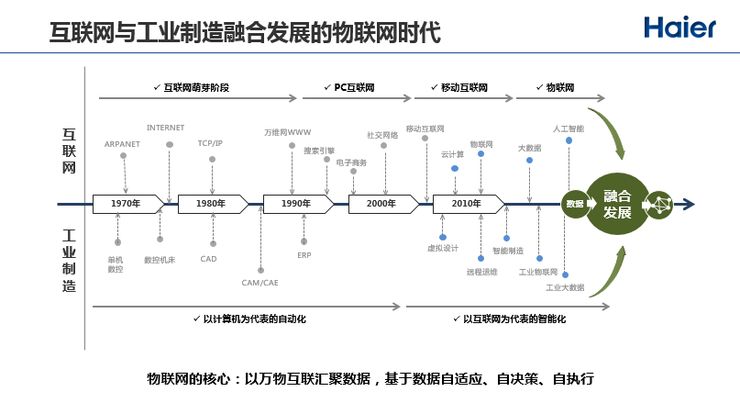 一个比较重要的趋势是互联网的发展和工业制造的发展在物联网时代真正开始融合,互联网连接的是人与人,工业制造连接的是设备与设备、物与物,在物联网时代,我们要连接的不光是物与物,还有物与人、物与人与服务,背后是万物互联的互联网产生大量的数据,这些数据可以供业务做决策,提升效率和降低成本,提升用户体验。