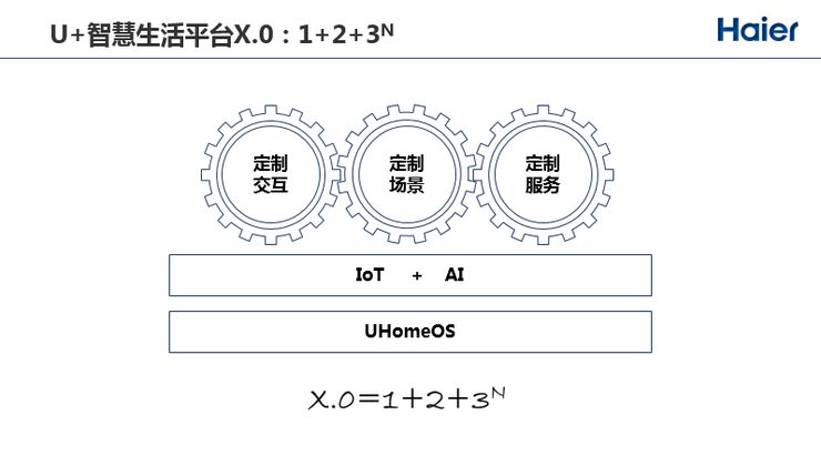 归纳来说是U+智慧解决方案平台是“1+2+3”能力,1代表UHome操作系统,基于微内核(Microkernel)在上面做各种各样的适应层,可以适应安卓、Linux,可以兼容背后的服务生态,这是一个国家级的平台,海尔牵头做这个国家重大专项。2代表AI+IoT双引擎,为联网家电提供互联互通,人工智能提供决策和判断。3代表各种各样为用户体验定制的能力,包括交互能力、场景能力和服务能力。