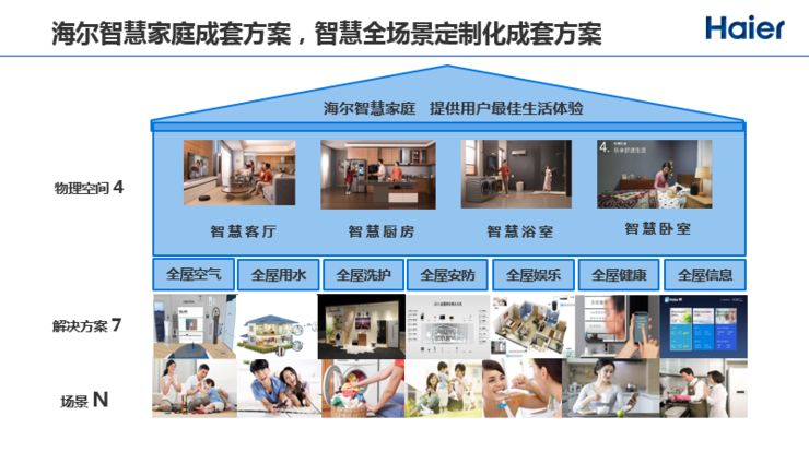 关于智慧家庭,海尔理解的全屋智能解决方案是“4+7+N”,4代表物理空间,如客厅、厨房、浴室、卧室,7代表解决方案,家里有老人、小孩、婴儿,每个人群需要不同的生活解决方案,N 代表智慧场景。