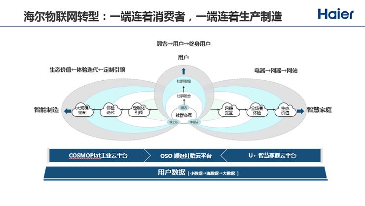 海尔从只是生产硬件的制造商转变为平台型企业,要做的是“硬件+软件+服务”。背后有三大平台:一是CosmoPlat工业云平台,107个工厂互联互通,通过传感、机器自动生产,和前面的需求完全匹配;二是OSO顺逛社群云平台;三是U+智慧生活平台,包括产品互联互通、云服务、人工智能处理数据,主动推荐解决方案。