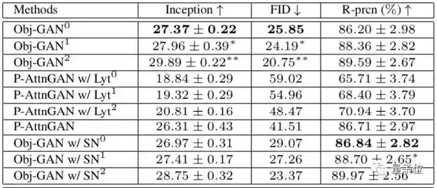 在客观指标上,Obj-GAN在大规模COCO基准测试的各种指标上优于先前的水平,Inception分数提高到了27,大大高于P-AttnGAN只有20左右的得分,FID也降低到了25.85。
