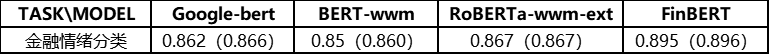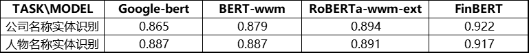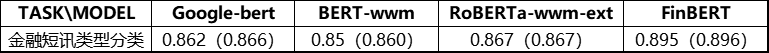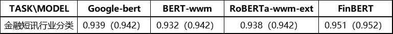 为了对比基线效果,我们从熵简科技实际业务中抽象出了四类典型的金融领域典型数据集,包括句子级和篇章级任务。在此基础上,我们将 FinBERT 与 Google 原生中文 BERT、哈工大讯飞实验室开源的 BERT-wwm 和 RoBERTa-wwm-ext 这三类在中文领域应用广泛的模型进行了下游任务的对比测试。在实验中,为了保持测试的公平性,我们没有进一步优化最佳学习率,对于四个模型均直接使用了 BERT-wwm 的最佳学习率:2e-5。