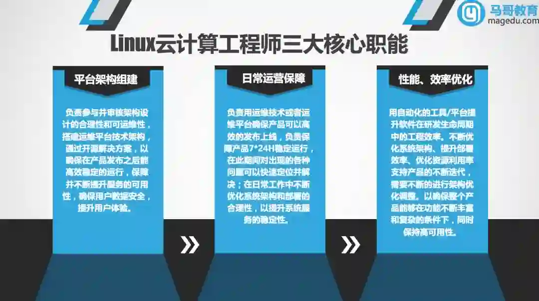所以,公司对技术的追求,也会转化为对运维工程师的技能和能力要求。Linux 运维工程师有三大核心职能: