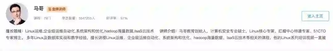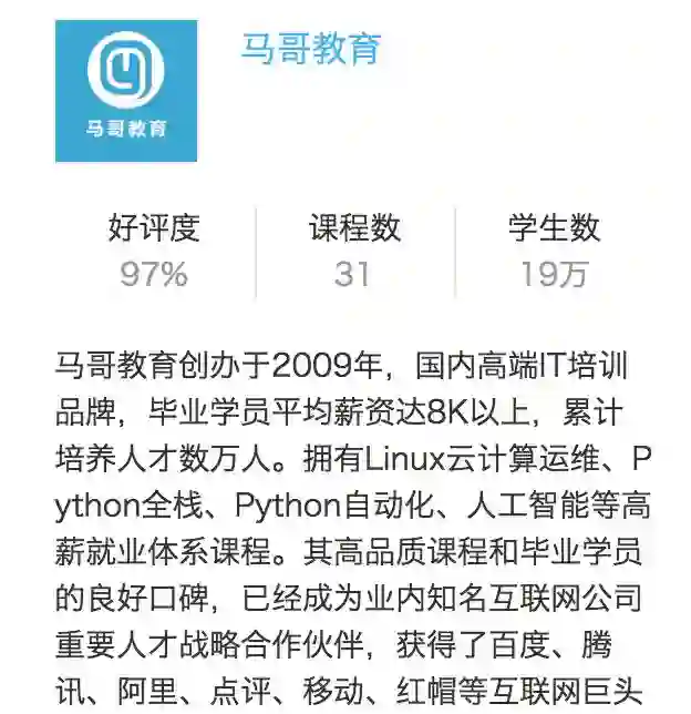 业内有句话,马哥出品,必是精品。马哥教育的 Linux 和 Python 课程,帮助了很多爱好者走进技术的殿堂。