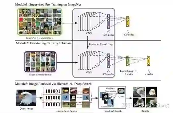 我们的方法由三个主要部分组成。 首先是ImageNet上的卷积神经网络的监督预训练,以学习丰富的中级图像表示。 在第二个组件中,我们为网络添加一个潜在层,并让该层中的神经元学习类似散列的表示,同时在目标域数据集上对其进行微调。