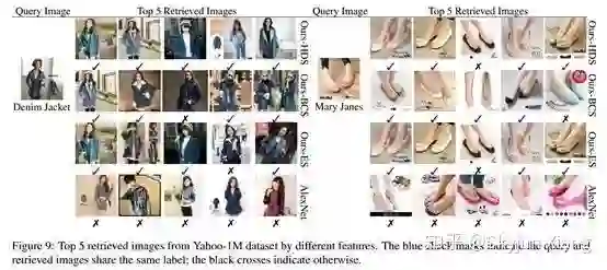 图9显示了不同功能检索的前5个图像。 可以看出,AlexNet检索的图像差异很大。 微调的模型比AlexNet检索更多的图像与查询具有相同的标签。 Ours-HDS,Ours-BCS和Ours-ES展示出良好的性能,并成功检索出类似的产品。