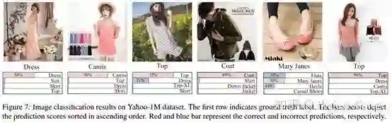 如图7所示,尽管服装图像没有背景或背景噪音,有或没有人,所提出的方法表现出良好的分类性能。 请注意,某些图像是未命中预测的,因为产品可能在某些特定类别之间不明确。 例如,如图7所示,可能难以区分Mary Janes和Flats。但是,我们的方法仍然可以检索类似于查询图像的图像。