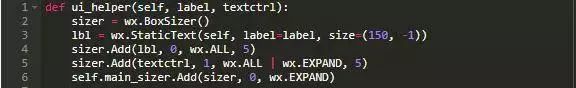 ui_helper()用于标签文本和文本控制部件,然后创建一个wx.BoxSizer和wx.StaticText。由于传入文本控制部件,wx.StaticText被添加进sizer。最后,将新的sizer添加到main_sizer中。这是减少冗余代码的好方法。