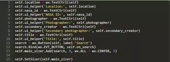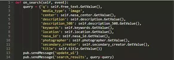 最后,将sizer设置为main_sizer。注意,并非所有NASA API中的过滤器都在此代码中实现。例如,我并没有添加media_type,因为此应用只用于图像搜索。但是,如果需要搜索视频或音频,可以更新此程序。此外,year_start和year_end也未实现。如果需要,可随时添加。