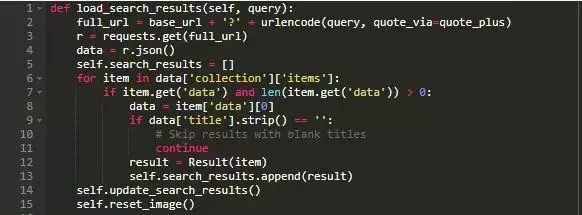 当使用pubsub时,将调用load_search_results()方法。main和advanced_search模块通过传递请求参数来调用,然后将结果编码为格式化的URL。接下来使用requests发送JSON请求,然后提取结果。此时也会调用reset_image()方法,以便在加载一组新结果时,不会选择任何内容。