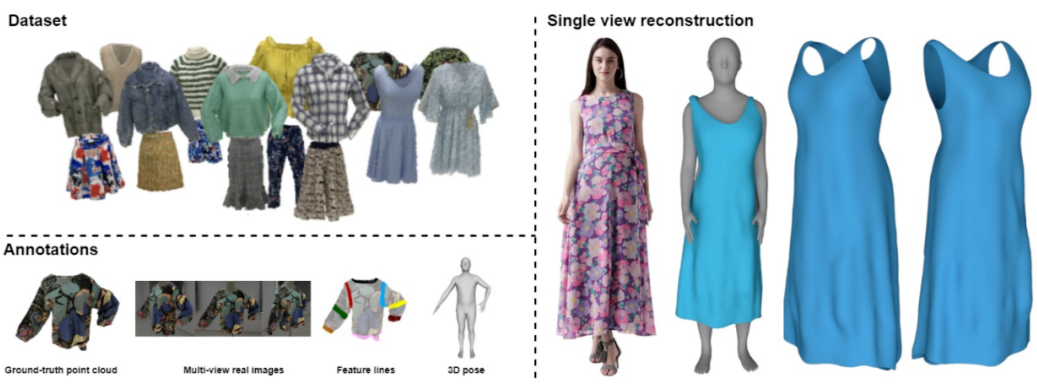 贡献:提出 Deep Fashion3D 数据集,包括 2000 件衣服,10 种类型,标记相应点云,多视角图像,3D body pose,和 feature lines;
