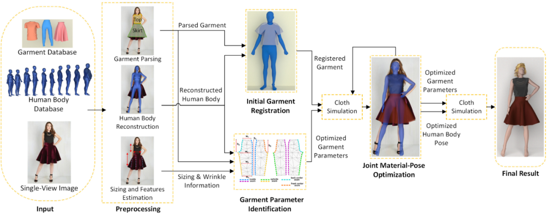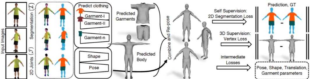 思路:衣服分割+衣服特征估计(尺码,布料,褶皱)+人体 mesh 估计,材质-姿态联合优化+衣物仿真;