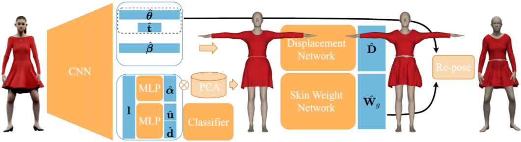 问题:过度依赖扫描 3D 人体真值来训练网络;需要较准确的 Pose 估计和 human parsing 做先验;较难处理复杂形变如长发裙子