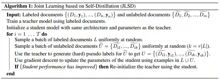 图 3描述了提出的 JSLD算法。其中, T表示训练迭代次数, r是超参数,它确定每次迭代中要采样多少未标记的文档, D代表文档, y是对应的标签。