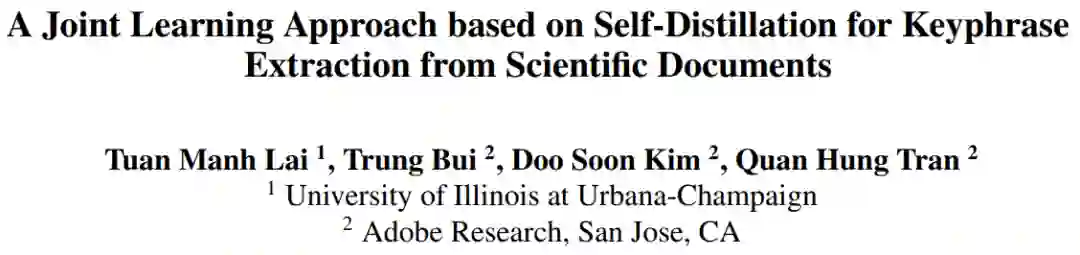 Keyphrase extraction 是提取一小组最能描述文档的短语任务。现有的大多数基准数据集都带有有限的带注释文档,使得训练复杂化的网络具有挑战性。本文提出一种基于自蒸馏思想的联合学习方法来利用大量未标记的科学文档,在 Inspec 和 SemEval-2017 两个公共基准上获得最新的结果。