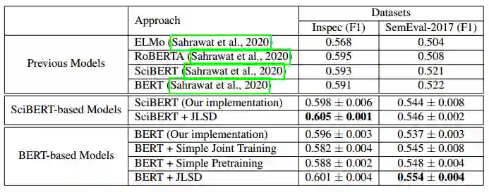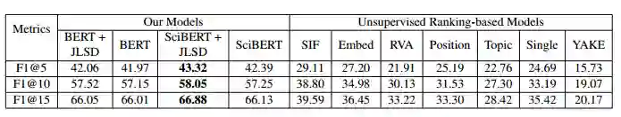 本文实现了两个具有不同预训练上下文嵌入的基线模型: BERT( base-cased)和 SciBERT( scivocab-cased)。并且分别与有监督的方法(表 1, Inspec和 SemEval-2017数据集)、无监督的方法(表 2, Inspec数据集)以及与其他迁移学习技术的比较(表 1, simple pretraining 、 simple joint training),实验结果显示,通过应用本文提出的联合学习方法( JLSD),可以不断提高基线模型的性能。