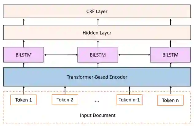 本文将 BiLSTM-CRF 架构用作基准架构 ,图 1显示了基线模型 层次 概述。给定一系列输入 tokens ,模型首先使用基于 Transformer 的编码器为每个 token 形成上下文表示 ,并且在基于 Transformer 的表示之上进一步使用了双向 LSTM ,之后,使用全连接层将双向 LSTM 的输出映射到标签空间。 最后,将线性链 CRF 应用于解码标签。