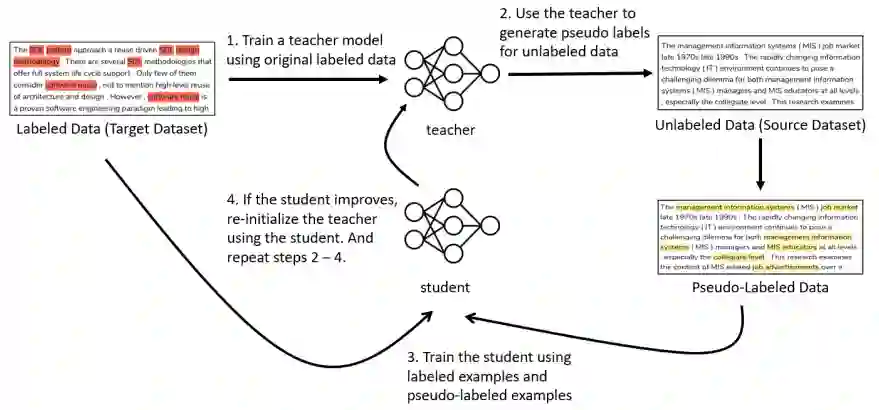 在训练过程中的任何时候,如果 student模型的性能有所提高(即在目标数据集的验证集上获得更好的结果),将使用 student模型的当前参数重新初始化 teacher模型,然后继续训练 student模型,并且使用之前相同的步骤。
