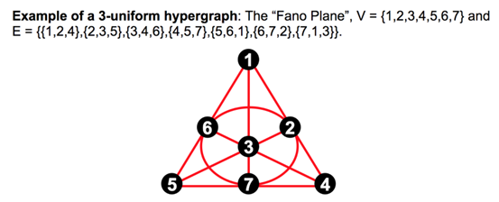 在图结构上,一般的边由两个节点所定义,而超边则可以由三个或更多的节点所定义,例如下图就是一个每条边包含三个节点的三阶超图: